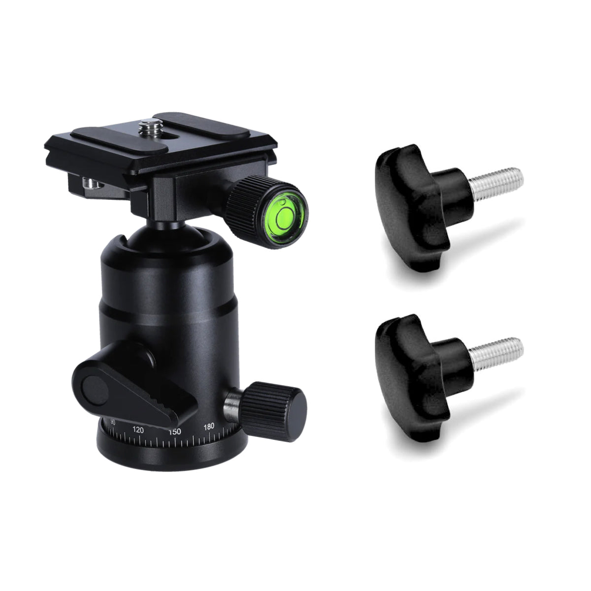 Comes with 2x custom-modified 3/8"-16 x 10mm Star Knob Screws for attaching the Ballhead to your SCHLEPP Camera Cart.
