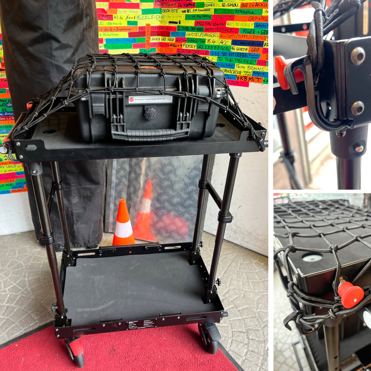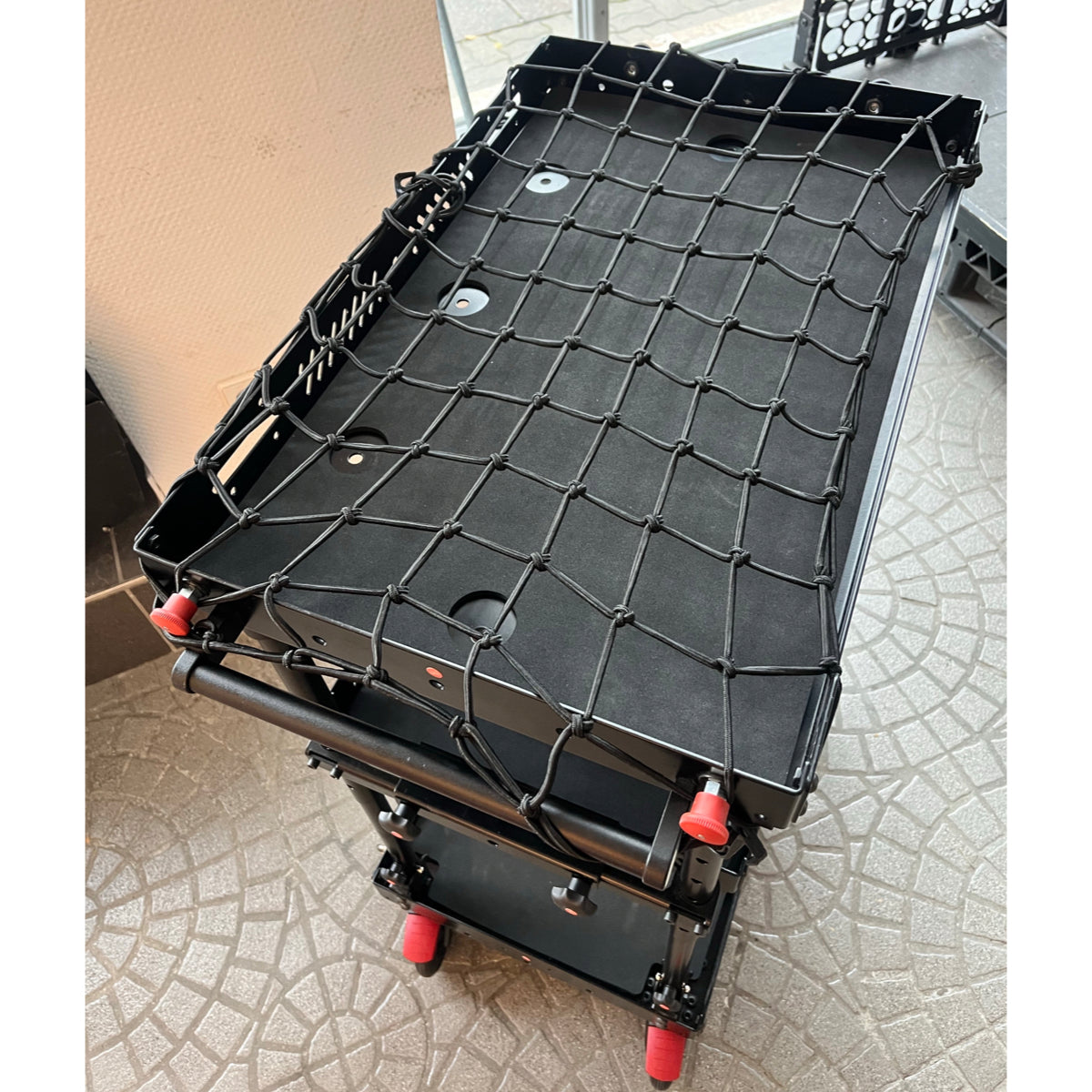 - elastic, robust 60x40 cm Cargo Net for securing your gear or load on the shelves of your SCHLEPP ONE Camera cart. Comes with 4x Hooks (detachable).